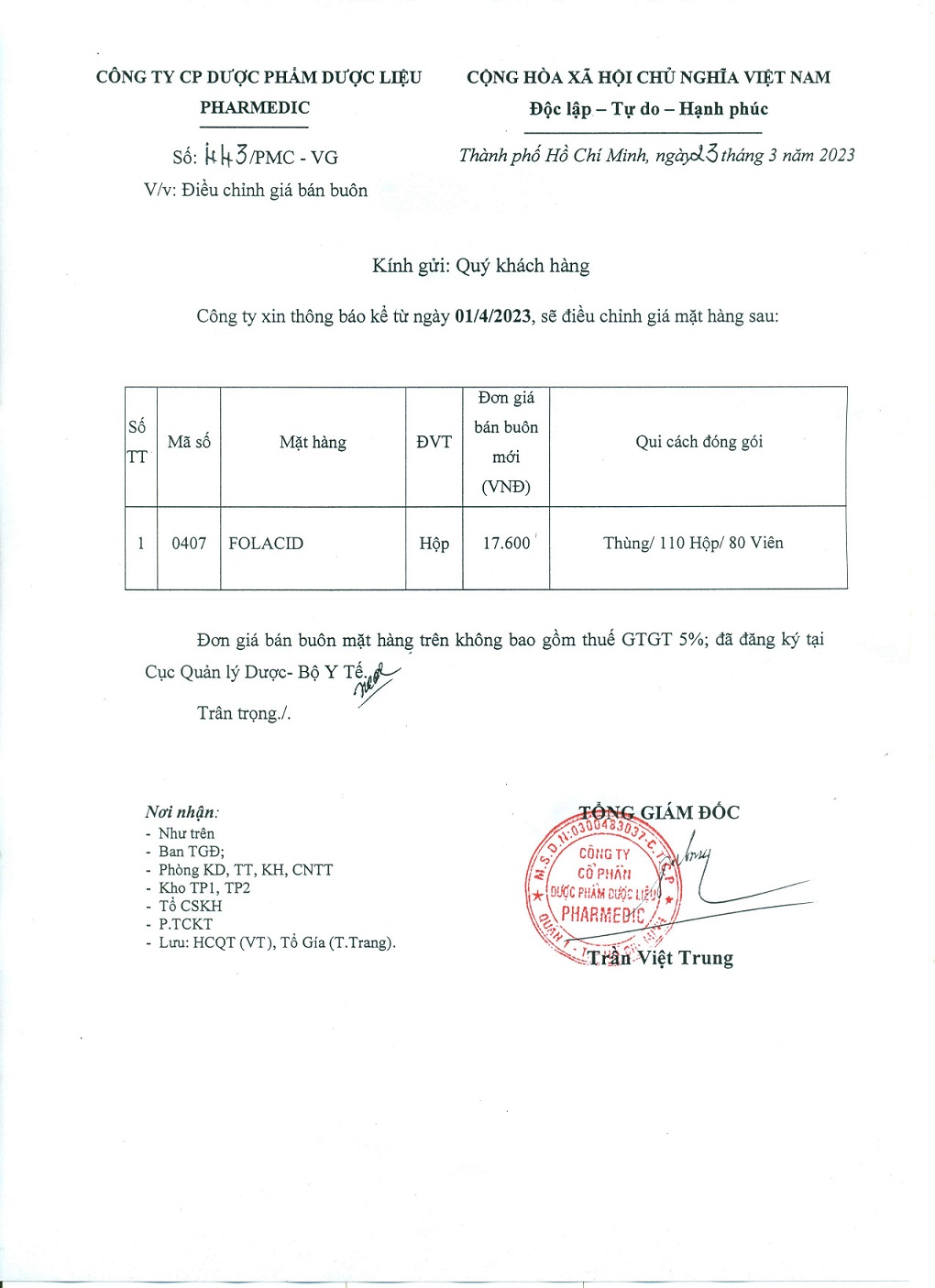 Thông báo kể từ ngày 01/04/2023 sẽ điều chỉnh giá mặt hàng FOLACID