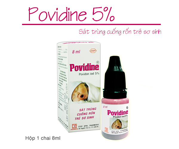 - Nhúng bông hút nước vô trùng hay tăm bông vô trùng vào Povidine 5% và xoa nhẹ cho thuốc thấm vào tất cả phần của cuống rốn. Có thể dùng vài lần bông hút nước vô trùng hay tăm bông vô trùng tẩm Povidine 5% để hoàn tất việc sát trùng này.